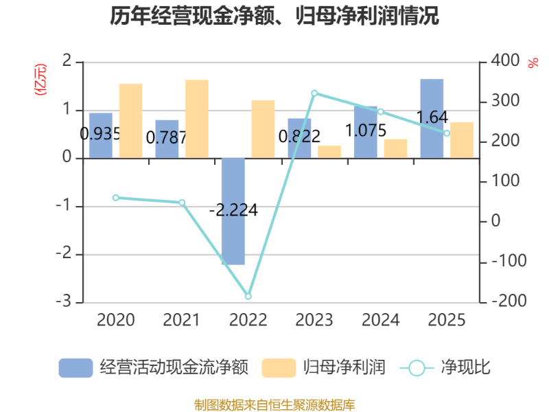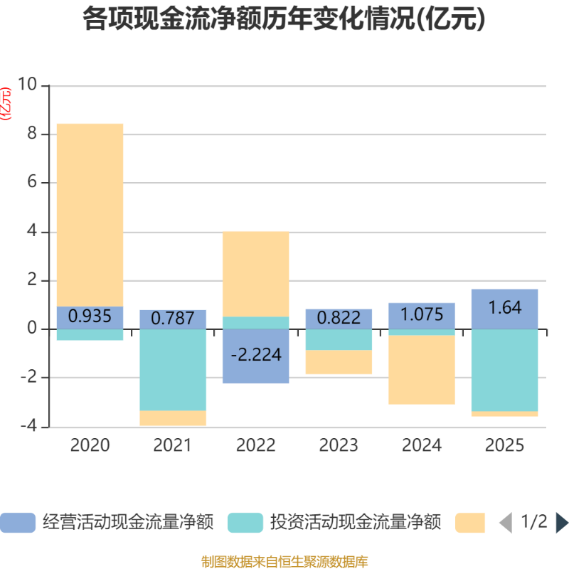 截至2025年,公司经营活动现金流净额为1.64亿元,同比增长52.6%;筹资活动现金流净额-2072.35万元,同比增加2.62亿元;投资活动现金流净额-3.37亿元,上年同期为-2578.51万元。