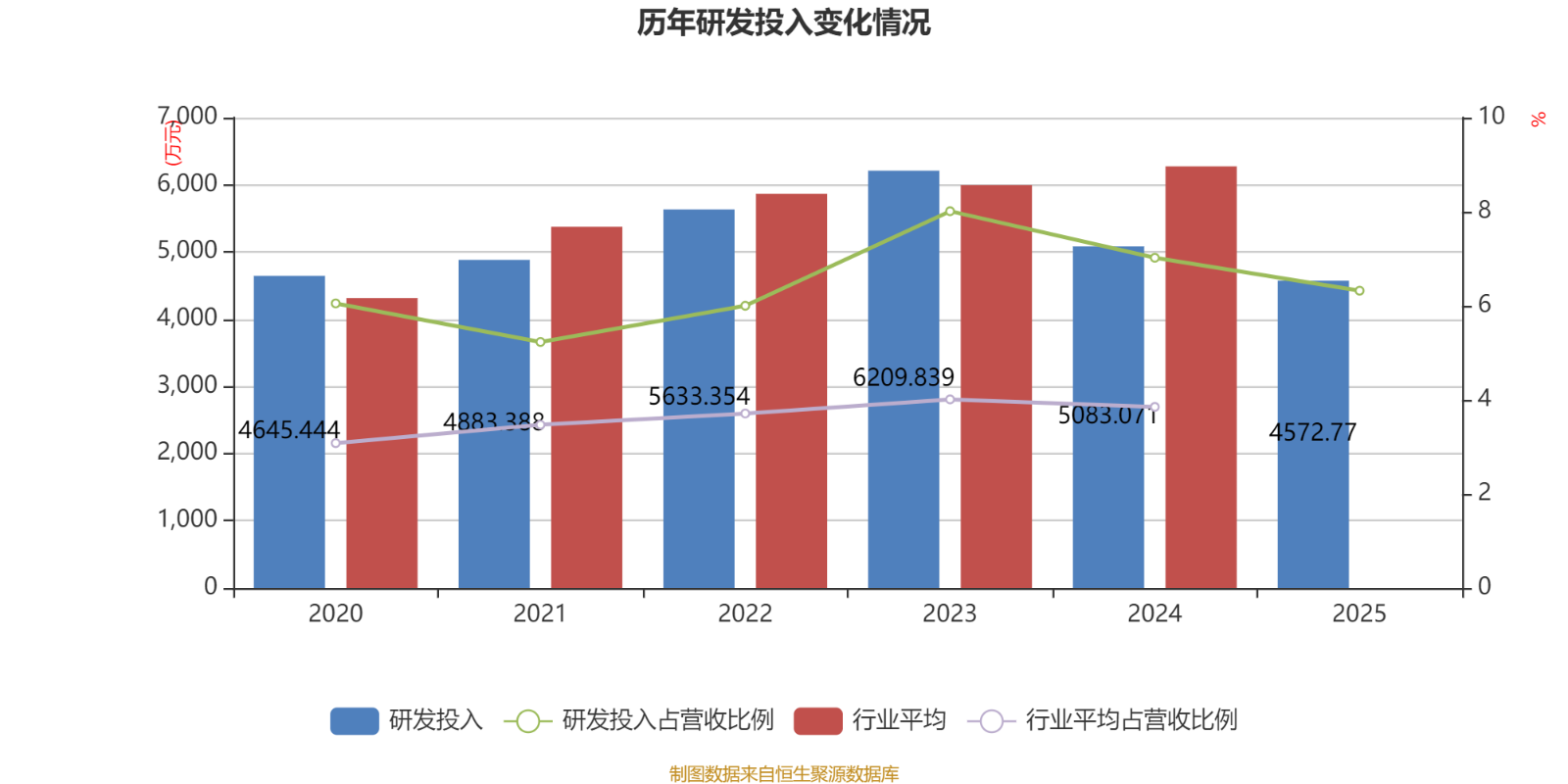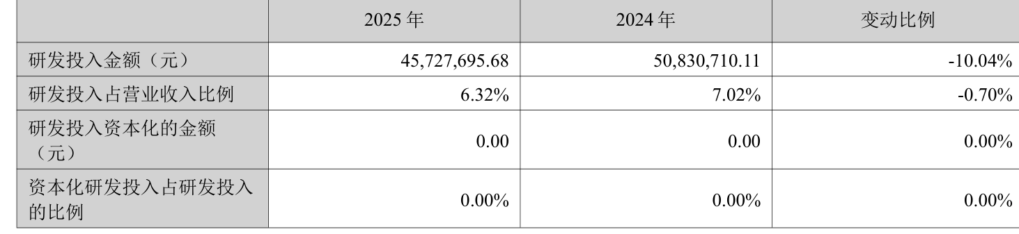 2025年全年,公司研发投入金额为4572.77万元,同比下降10.04%;研发投入占营业收入比例为6.32%,相比上年同期下降0.7个百分点。此外,公司全年研发投入资本化率为0%。
