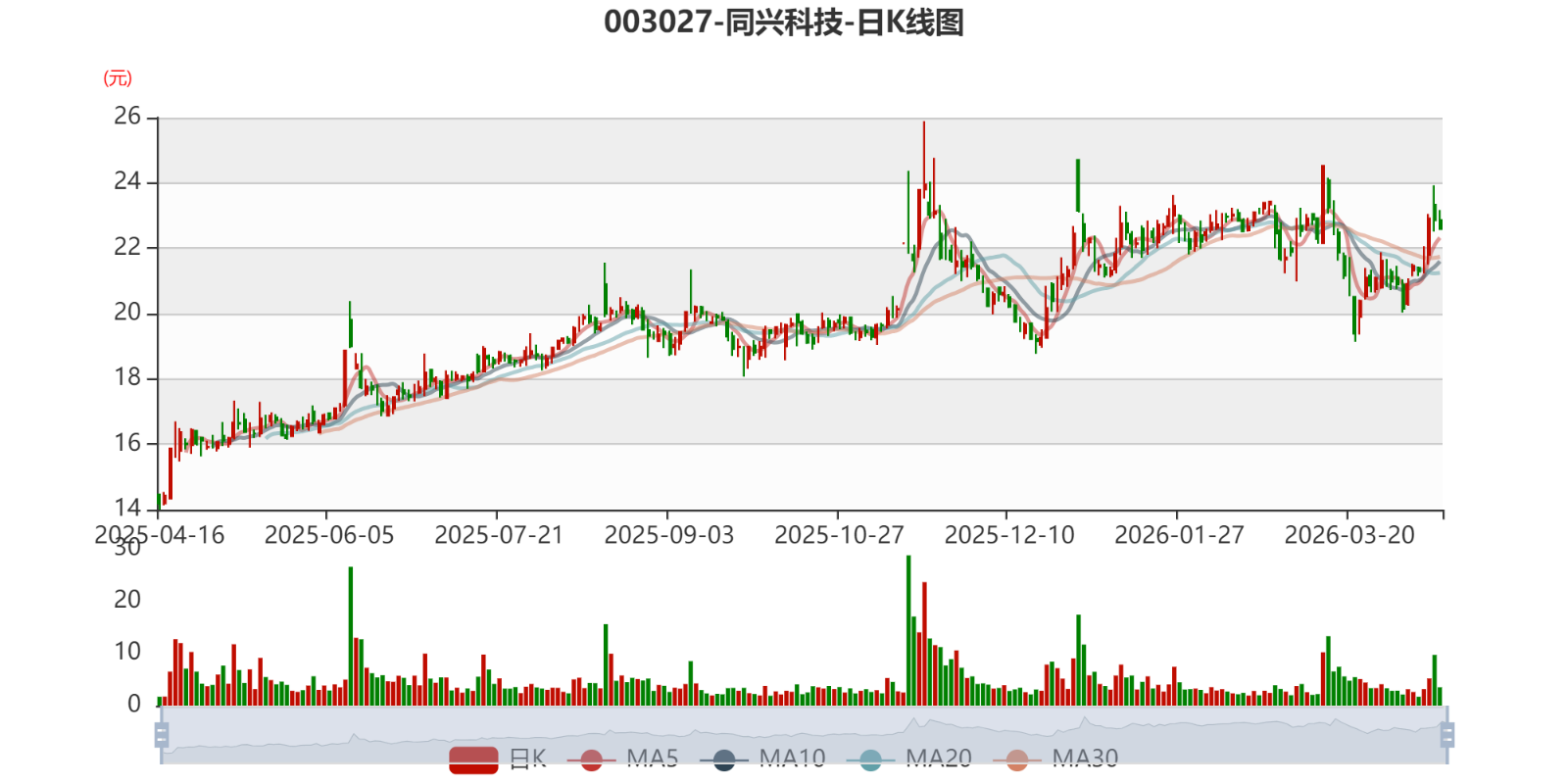 中证智能财讯同兴科技(003027)4月16日披露2025年年度报告。2025年,公司实现营业总收入7.24亿元,同比下降0.09%;归母净利润7397.94万元,同比增长89.52%;扣非净利润6604.66万元,同比增长196.94%;经营活动产生的现金流量净额为1.64亿元,同比增长52.60%;报告期内,同兴科技基本每股收益为0.57元,加权平均净资产收益率为4.31%。公司2025年度分配预案为:拟向全体股东每10股派现3元(含税)。