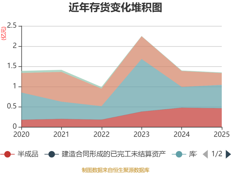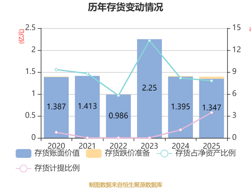 从存货变动来看,截至2025年末,公司存货账面价值为1.35亿元,占净资产的7.81%,较上年末减少484.26万元。其中,存货跌价准备为482.95万元,计提比例为3.46%。