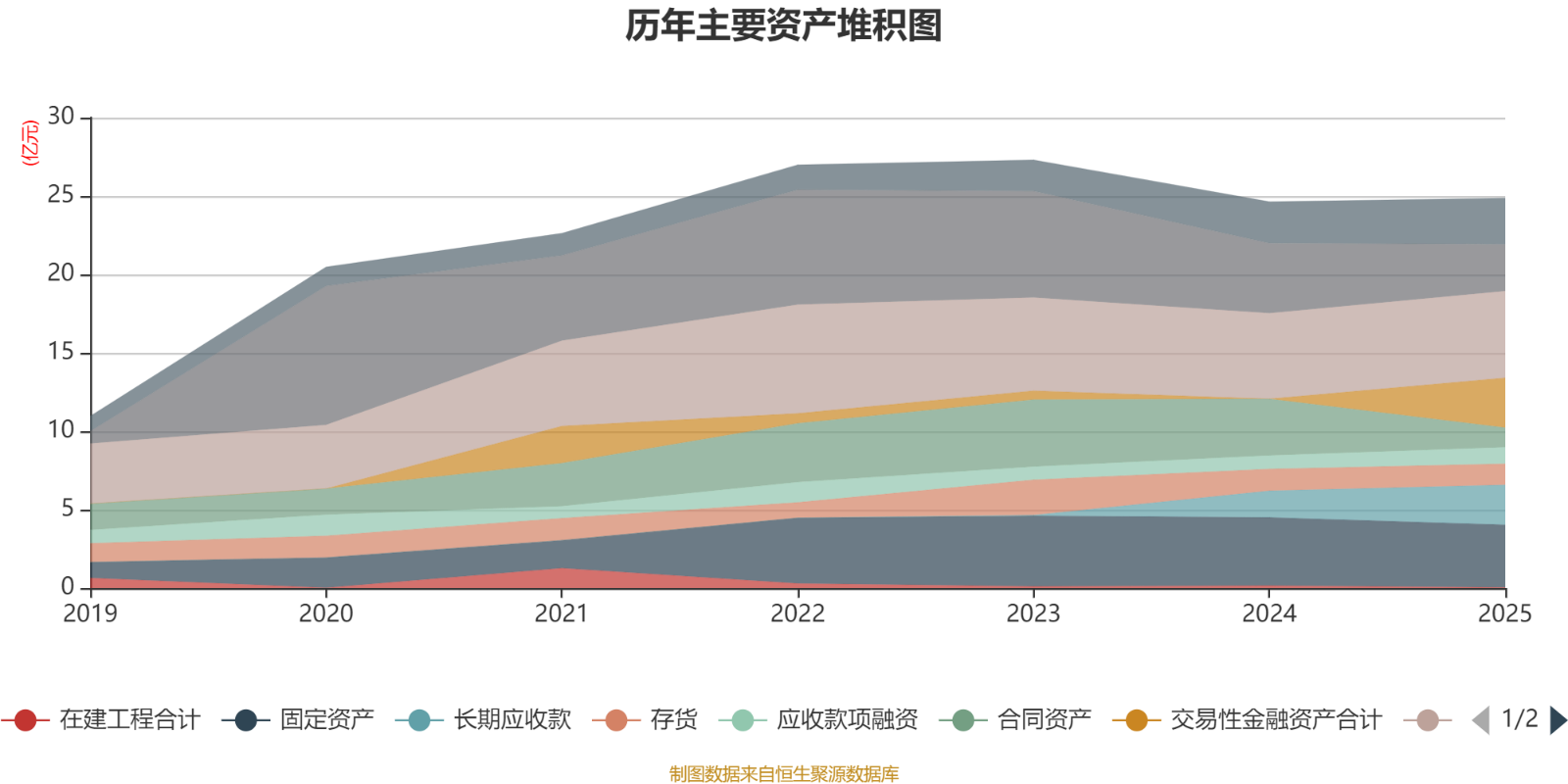 资产重大变化方面,截至2025年末,公司交易性金融资产合计占公司总资产的12.8%,上年末为0;合同资产较上年末减少65.61%,占公司总资产比重下降9.68个百分点;货币资金较上年末减少33.11%,占公司总资产比重下降6.12个百分点;长期应收款较上年末增加50.06%,占公司总资产比重上升3.35个百分点。