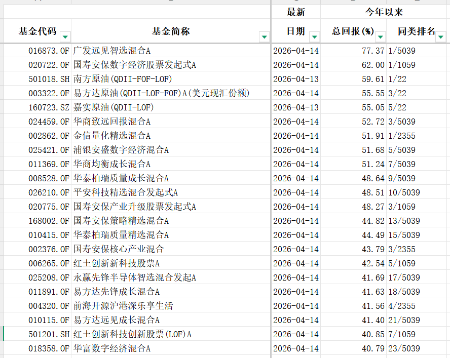 同花顺数据显示,今年以来(截至4月14日,下同),收益最高的公募产品是广发远见智选混合A,年内净值涨幅超过77%;国寿安保数字经济股票发起式A、南方原油(QDII-FOF-LOF)、易方达原油(QDII-LOF-FOF)A(美元现汇份额)、嘉实原油(QDII-LOF)、华商致远回报混合A等8只产品净值涨幅超过50%;汇添富中证油气资源ETF、博时中证油气资源ETF等多只石油相关主题基金收益居前。