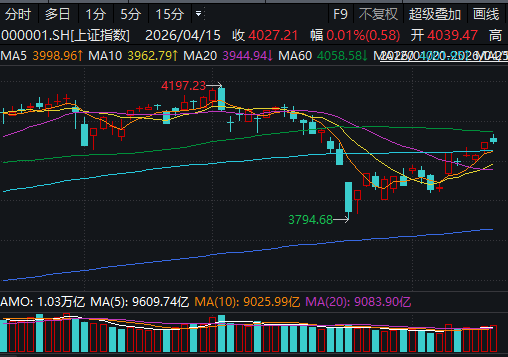 4月15日,上证指数小幅高开后出现窄幅震荡走势,盘中反弹在靠近60日均线时便转头向下,尾盘指数一度翻绿,收盘时勉强收红。深证成指则是在全日最高点开盘后便一路震荡走低,尾盘跌幅收窄。创业板指走势和深证成指走势相仿,但跌幅更大。