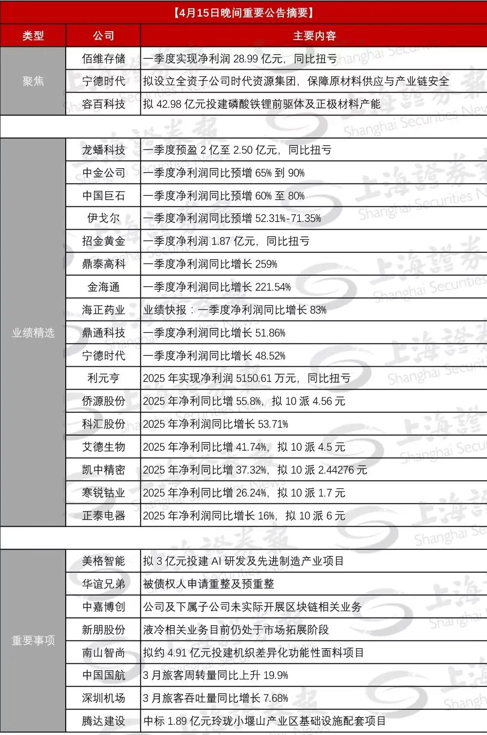 中国巨石:披露业绩预告。经财务部门初步测算,预计2026年第一季度实现归属于上市公司股东的净利润为116,866.86万元至131,475.22万元,与上年同期(法定披露数据)相比,将增加43,825.07万元至58,433.43万元,同比增加60%至80%。公司表示:2026年第一季度,玻纤主要下游应用领域需求增加,产品量价齐升。公司通过加快产品结构优化、加大技术创新力度、加强市场开拓等措施提升盈利能力,为本期业绩增长奠定了良好基础。