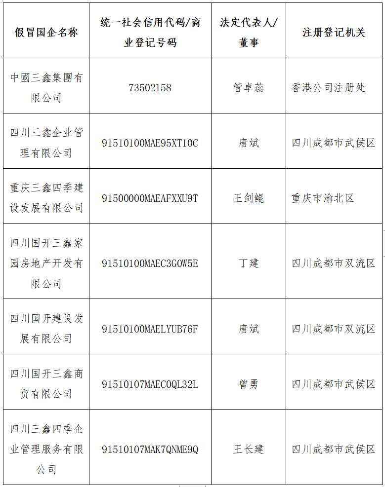 国家开发投资集团有限公司4月15日发布声明称,近期,经我司核实,发现中國三鑫集團有限公司系通过提供伪造文件及/或虚假信息等方式,注册登记为我司下属企业,中國三鑫集團有限公司及其在境内外投资的各级子企业(部分企业情况见下表)均为假冒国企,与我司及关联企业无任何隶属或股权关系,也不存在任何投资、合作、业务等关系,其一切行为均与我司无关。