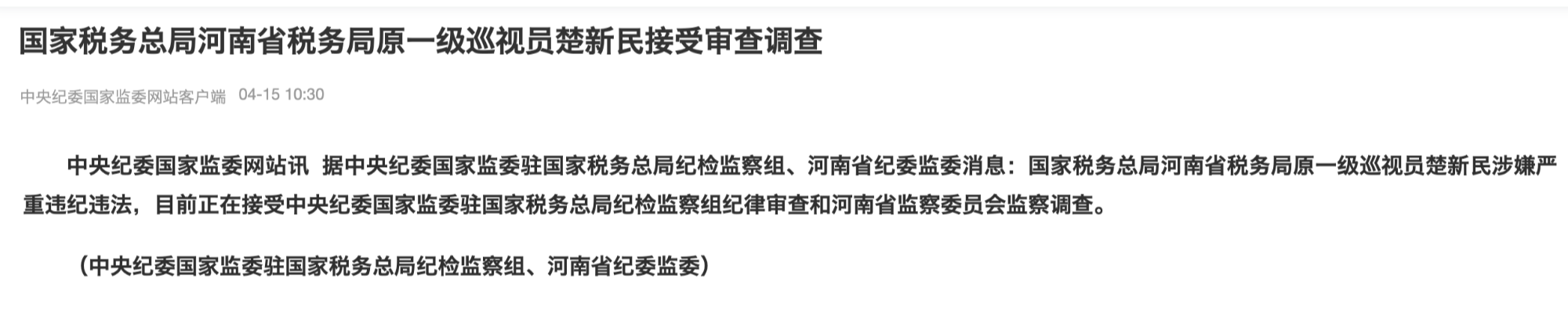 4月15日,中央纪委国家监委网站通报,国家税务总局河南省税务局原一级巡视员楚新民涉嫌严重违纪违法,目前正在接受中央纪委国家监委驻国家税务总局纪检监察组纪律审查和河南省监察委员会监察调查。