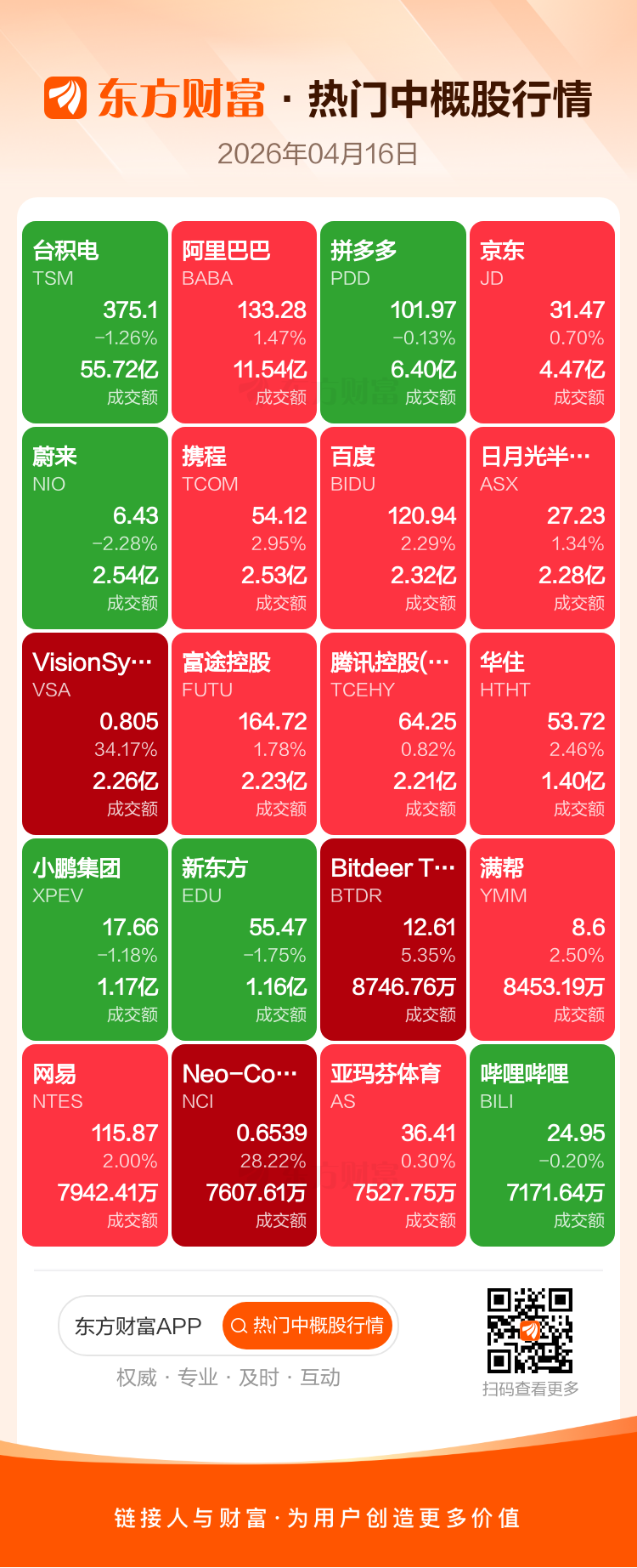 台积电跌1.26%,阿里巴巴涨1.47%,拼多多跌0.13%,京东涨0.70%,蔚来跌2.28%,携程涨2.95%,百度涨2.29%,日月光半导体涨1.34%,VisionSys AI Inc ADR涨34.17%,富途控股涨1.78%。