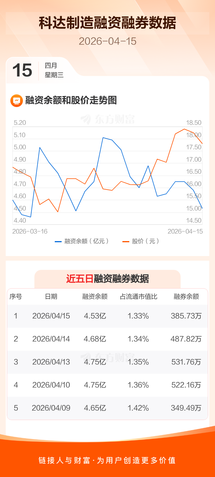 交易所最新数据显示,科达制造于2026年4月15日获融资买入2436.82万元,融资偿还3863.95万元,当日融资净偿还1427.12万元。目前,该股融资余额4.53亿,占流通市值比例为1.33%。