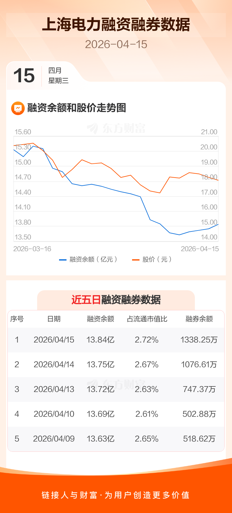 交易所最新数据显示,上海电力于2026年4月15日获融资买入7864.12万元,融资偿还7010.74万元,当日融资净买入853.38万元。目前,该股融资余额13.84亿,占流通市值比例为2.72%。