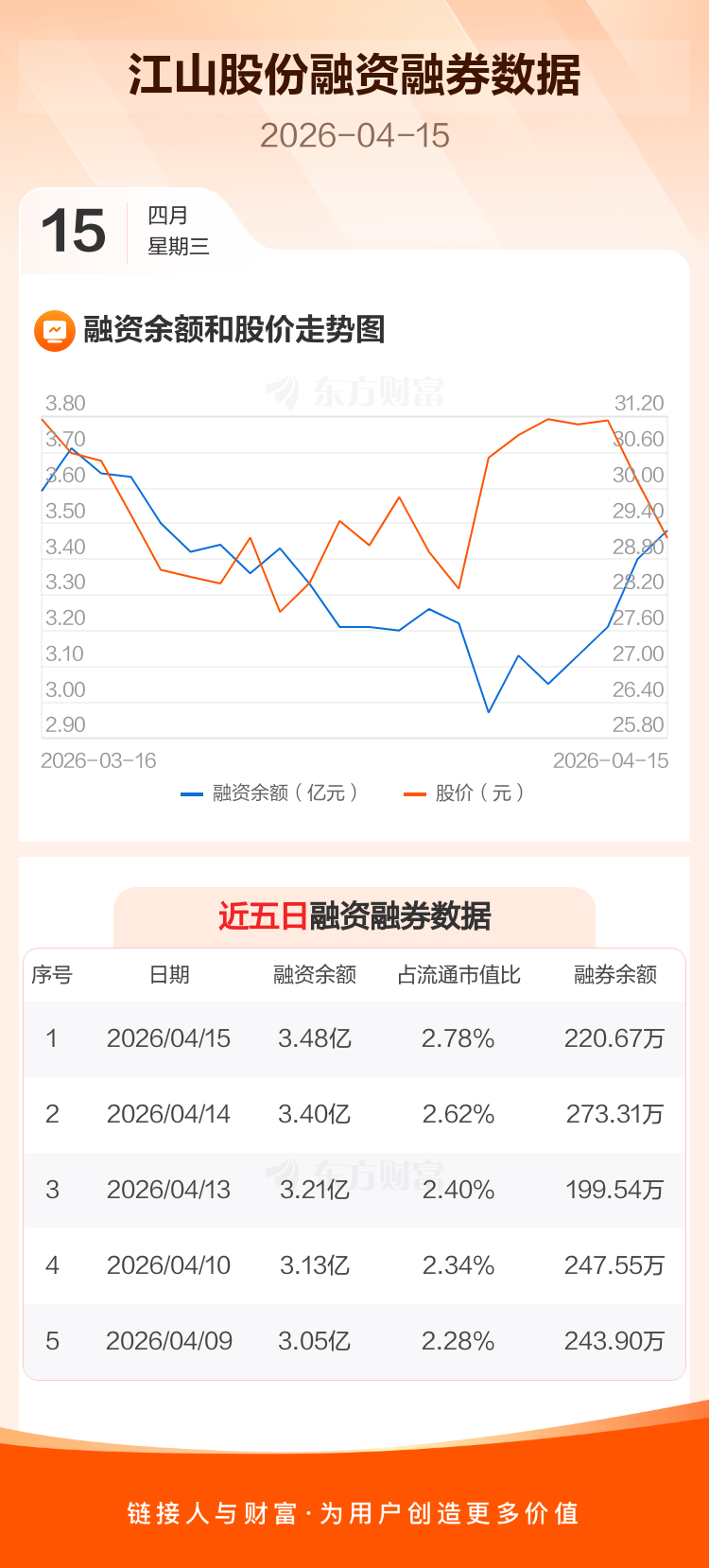 交易所最新数据显示,江山股份于2026年4月15日获融资买入2817.28万元,融资偿还1958.79万元,当日融资净买入858.49万元。目前,该股融资余额3.48亿,占流通市值比例为2.78%。
