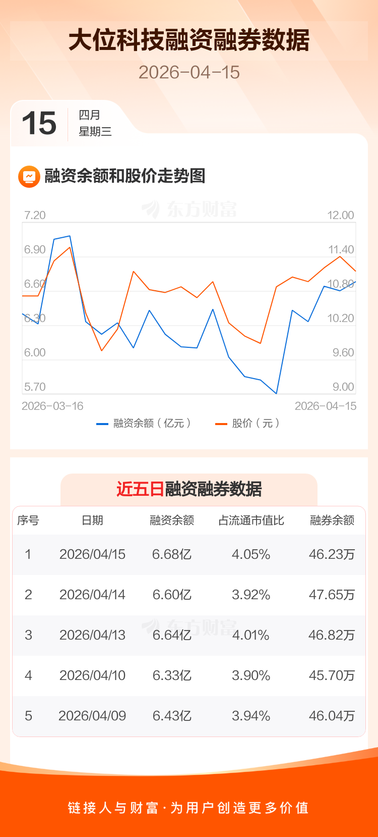 交易所最新数据显示,大位科技于2026年4月15日获融资买入1.28亿元,融资偿还1.21亿元,当日融资净买入733.31万元。目前,该股融资余额6.68亿,占流通市值比例为4.05%。