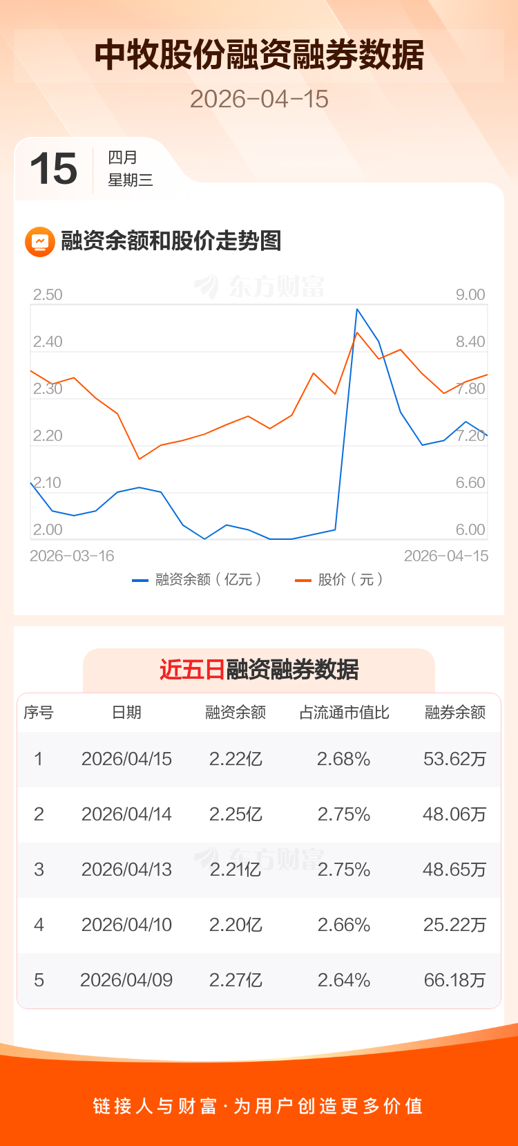 交易所最新数据显示,中牧股份于2026年4月15日获融资买入2433.72万元,融资偿还2698.91万元,当日融资净偿还265.19万元。目前,该股融资余额2.22亿,占流通市值比例为2.68%。