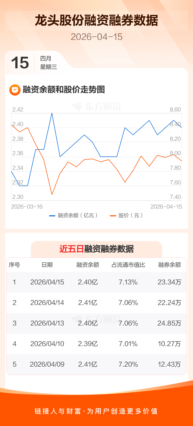 交易所最新数据显示,龙头股份于2026年4月15日获融资买入266.13万元,融资偿还304.67万元,当日融资净偿还38.54万元。目前,该股融资余额2.40亿,占流通市值比例为7.13%。