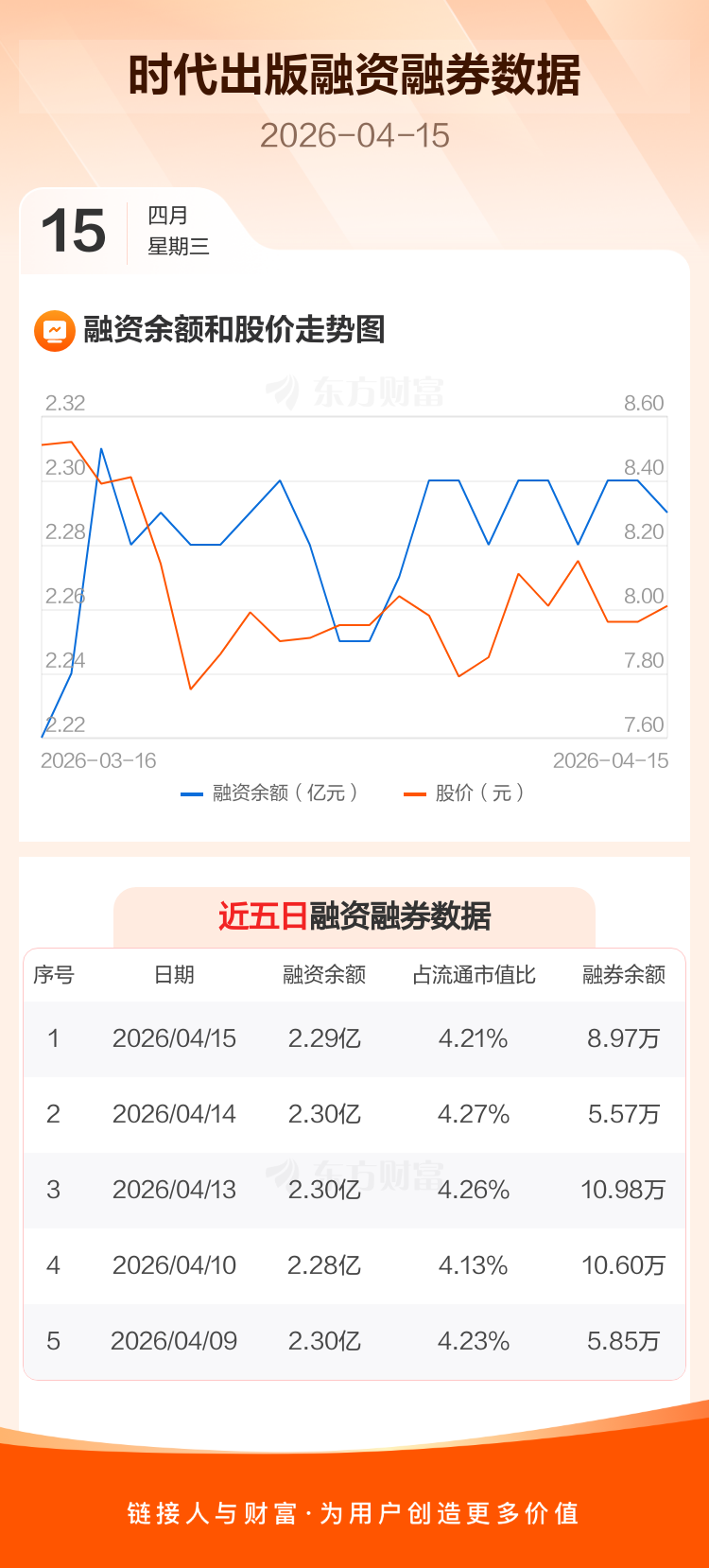 交易所最新数据显示,时代出版于2026年4月15日获融资买入198.89万元,融资偿还350.13万元,当日融资净偿还151.24万元。目前,该股融资余额2.29亿,占流通市值比例为4.21%。