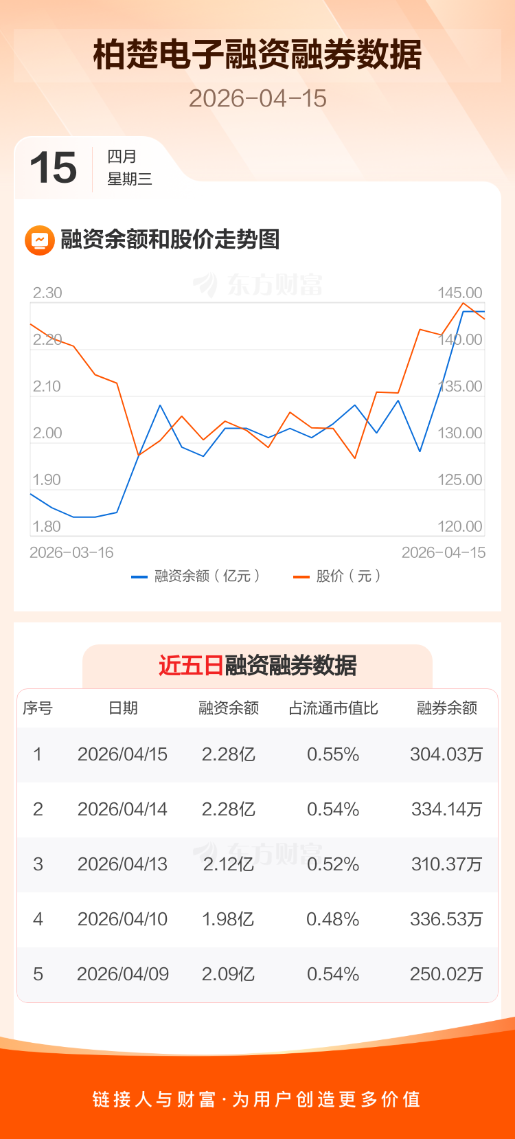 交易所最新数据显示,柏楚电子于2026年4月15日获融资买入1891.66万元,融资偿还1819.39万元,当日融资净买入72.28万元。目前,该股融资余额2.28亿,占流通市值比例为0.55%。