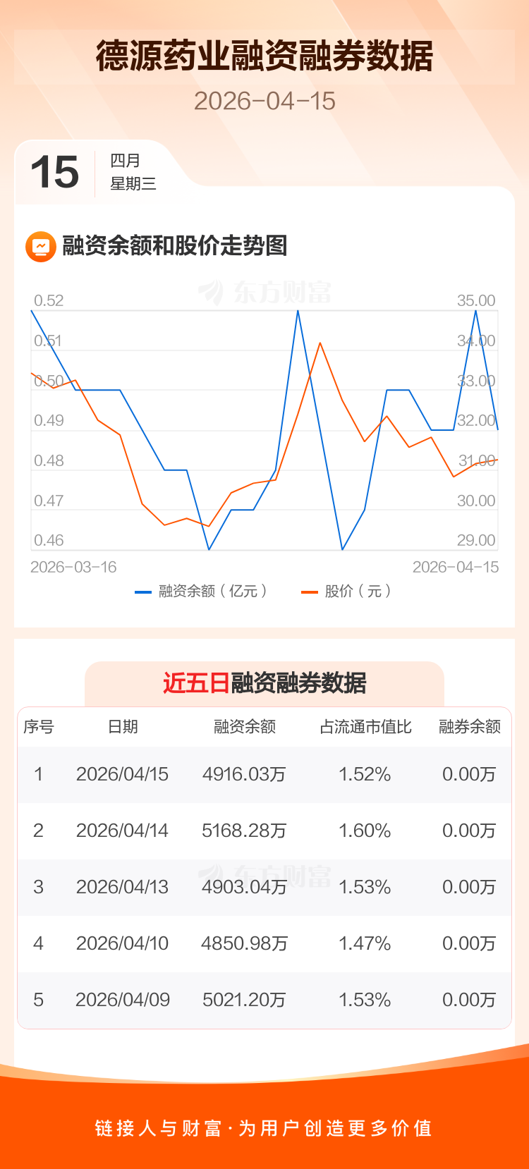 交易所最新数据显示,德源药业于2026年4月15日获融资买入370.44万元,融资偿还622.69万元,当日融资净偿还252.25万元。目前,该股融资余额4916.03万,占流通市值比例为1.52%。