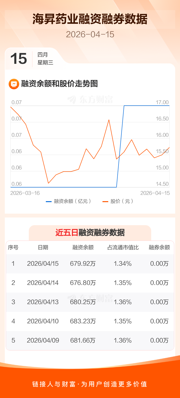 交易所最新数据显示,海昇药业于2026年4月15日获融资买入8.87万元,融资偿还5.74万元,当日融资净买入3.13万元。目前,该股融资余额679.92万,占流通市值比例为1.34%。