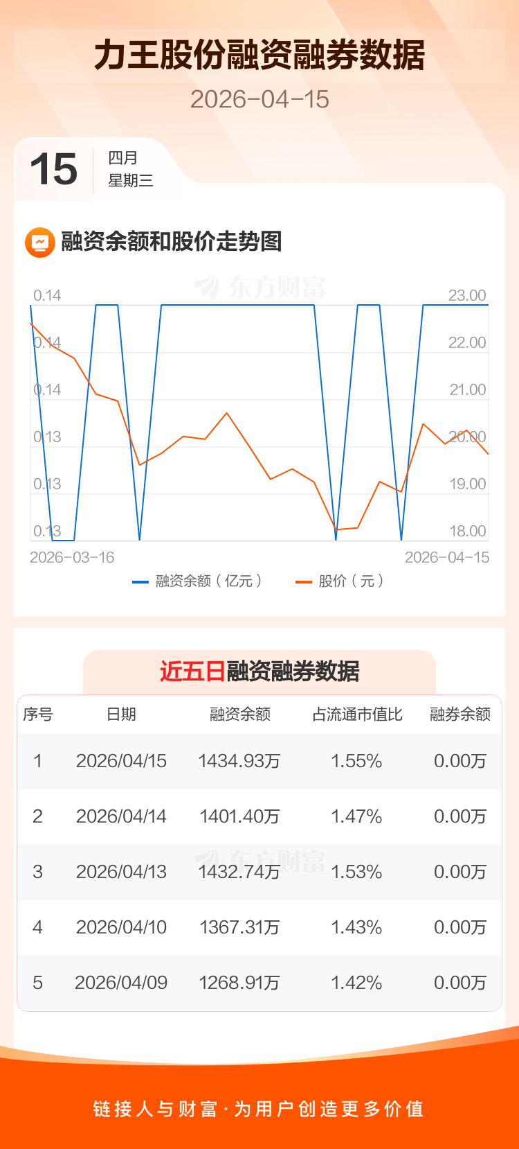 交易所最新数据显示,力王股份于2026年4月15日获融资买入122.12万元,融资偿还88.59万元,当日融资净买入33.53万元。目前,该股融资余额1434.93万,占流通市值比例为1.55%。