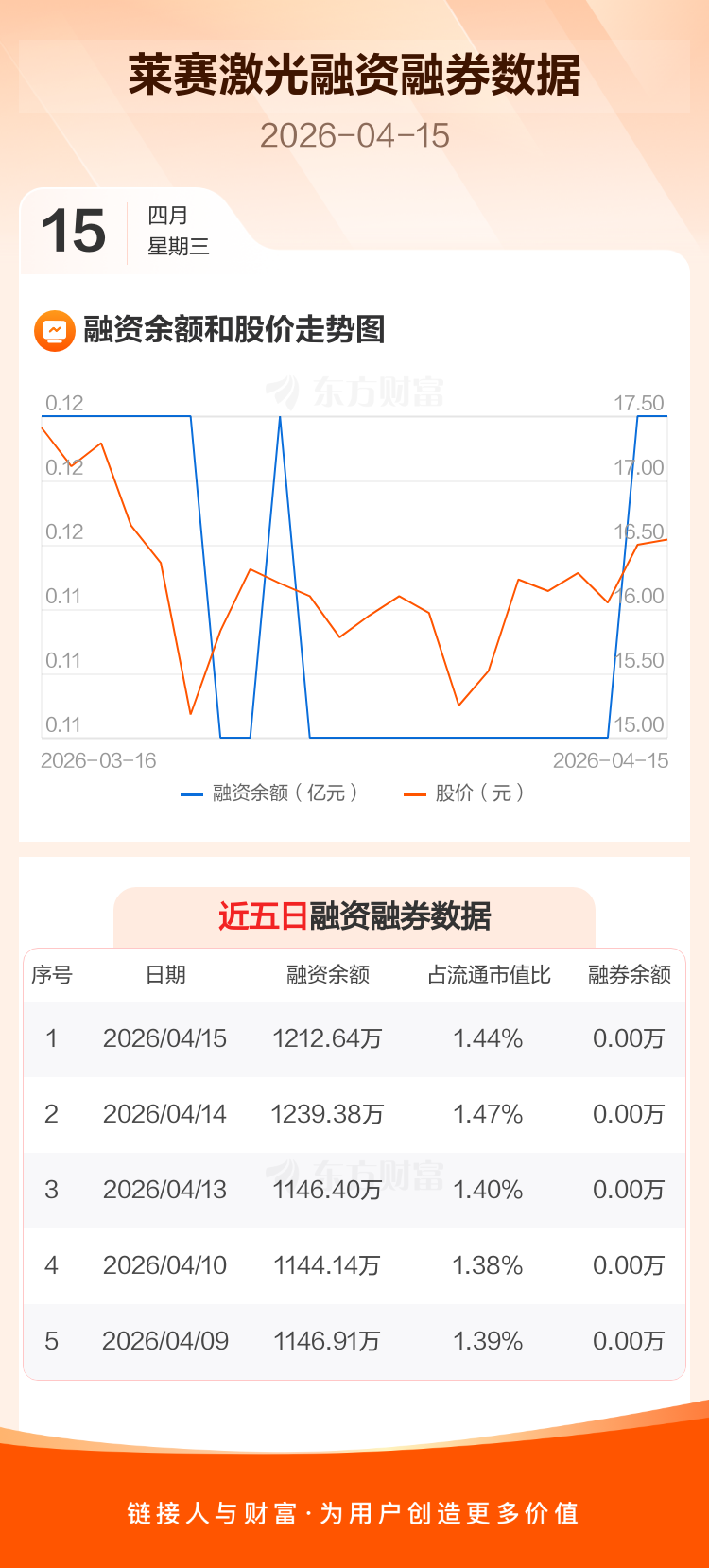 交易所最新数据显示,莱赛激光于2026年4月15日获融资买入113.97万元,融资偿还140.72万元,当日融资净偿还26.75万元。目前,该股融资余额1212.64万,占流通市值比例为1.44%。