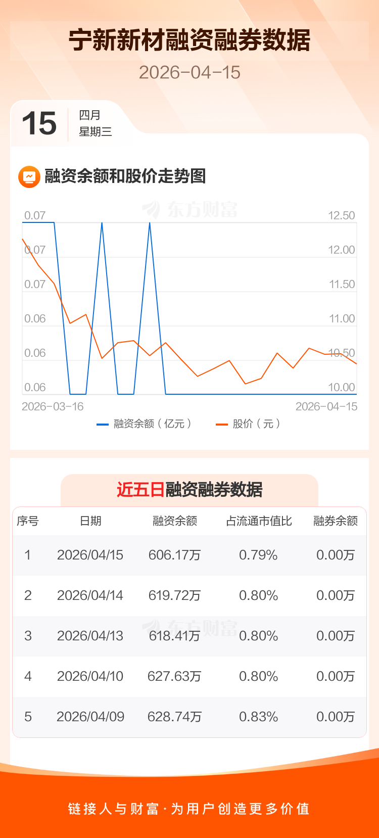 交易所最新数据显示,宁新新材于2026年4月15日获融资买入0元,融资偿还13.55万元,当日融资净偿还13.55万元。目前,该股融资余额606.17万,占流通市值比例为0.79%。