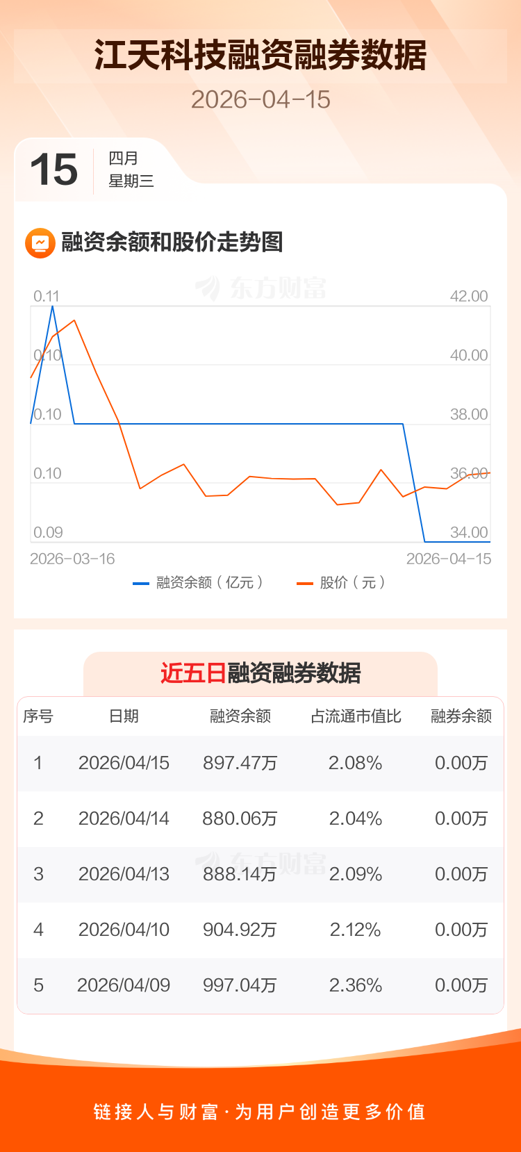 交易所最新数据显示,江天科技于2026年4月15日获融资买入27.97万元,融资偿还10.56万元,当日融资净买入17.42万元。目前,该股融资余额897.47万,占流通市值比例为2.08%。