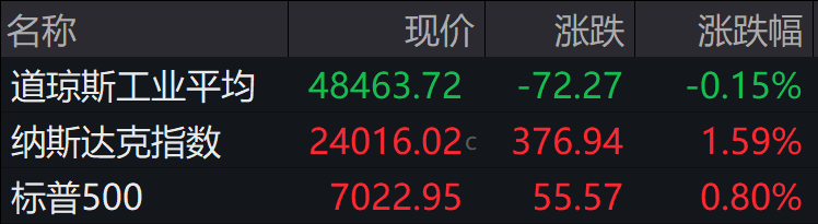 当地时间周三,美股三大股指走势分化,标普500指数与纳指收于历史新高。截至收盘,道指跌0.15%,纳指涨1.59%,标普500指数涨0.80%。