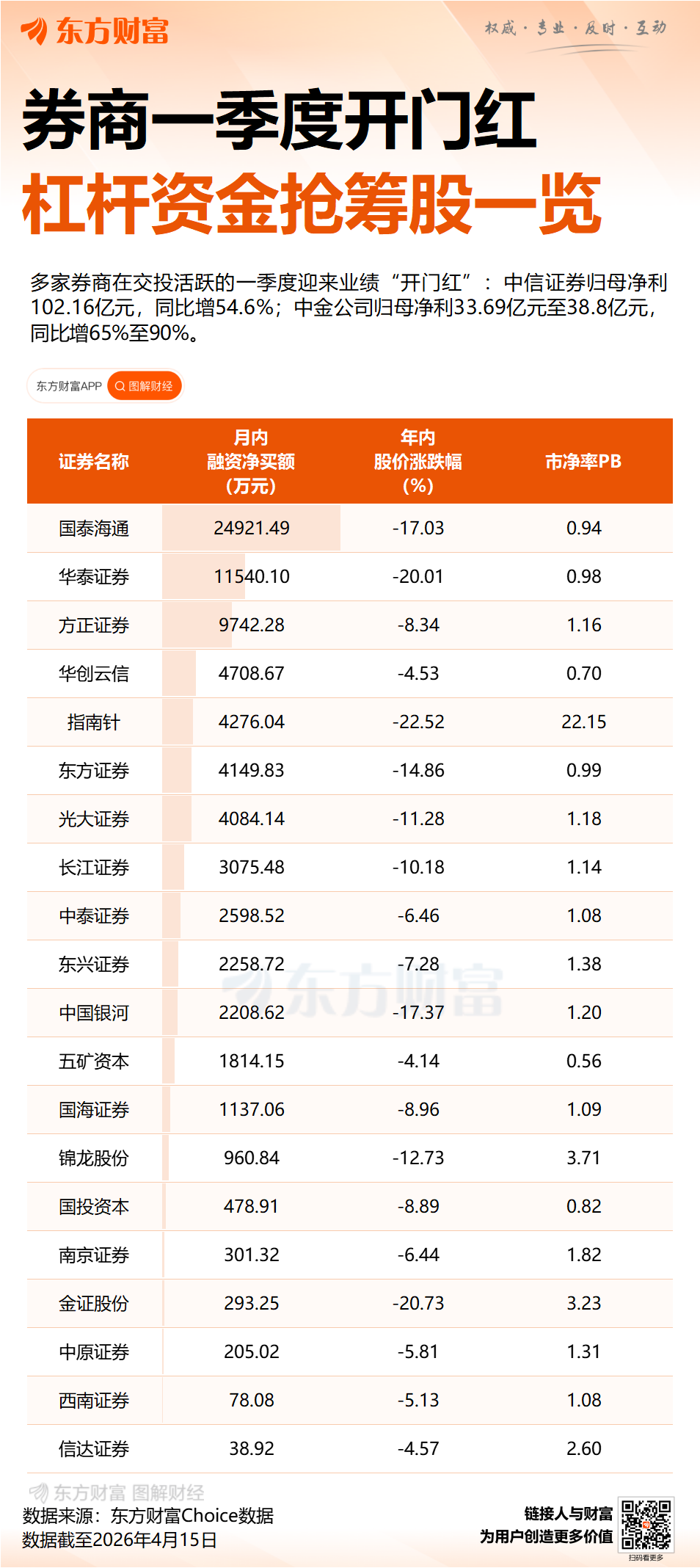 两融余额攀升:一季度日均两融余额达2.66万亿,环比增3%,同比增42%,为券商的利息净收入提供了支撑。