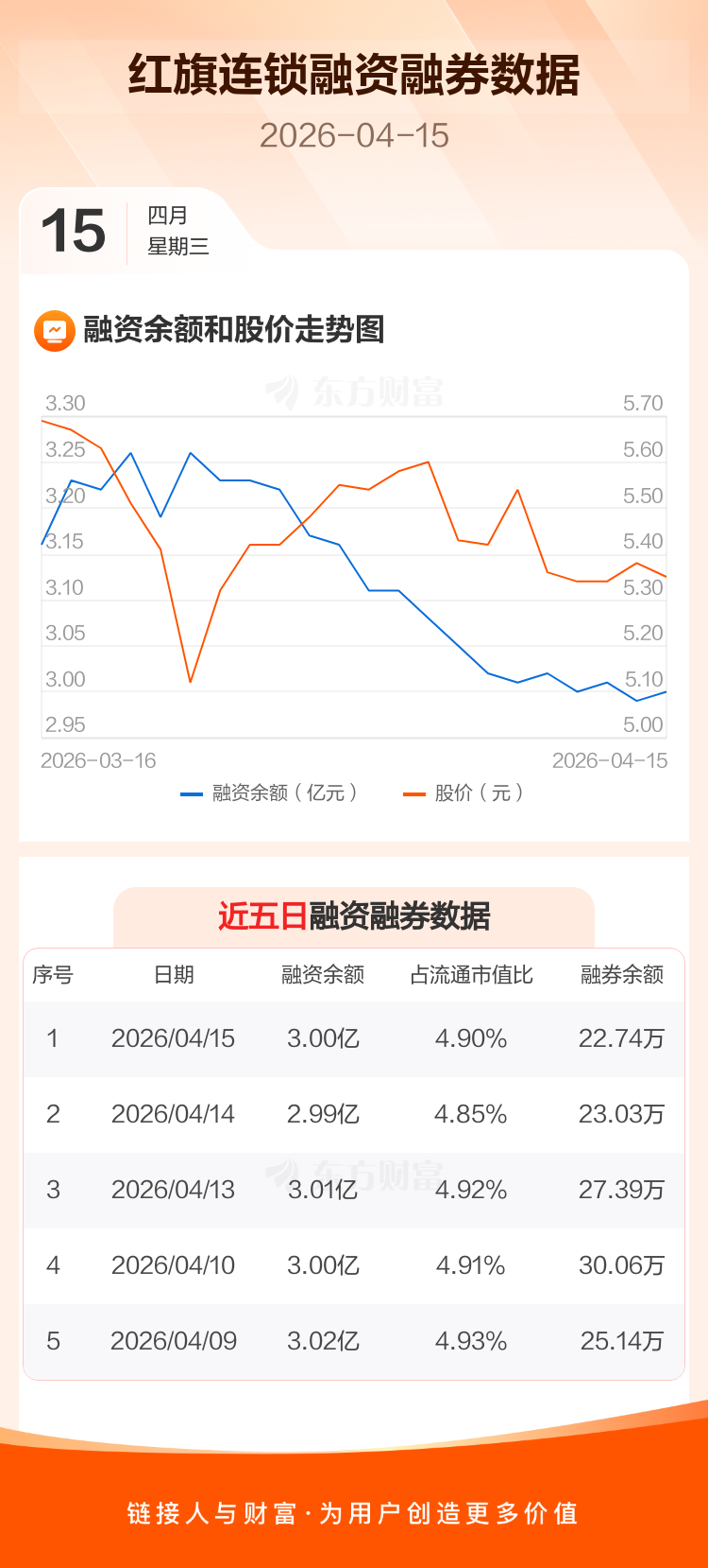 交易所最新数据显示,红旗连锁于2026年4月15日获融资买入616.69万元,融资偿还468.81万元,当日融资净买入147.88万元。目前,该股融资余额3.00亿,占流通市值比例为4.90%。