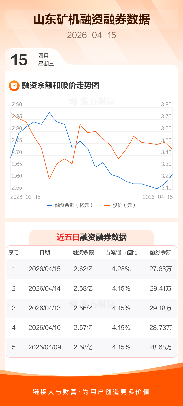 交易所最新数据显示,山东矿机于2026年4月15日获融资买入846.92万元,融资偿还505.12万元,当日融资净买入341.81万元。目前,该股融资余额2.62亿,占流通市值比例为4.28%。