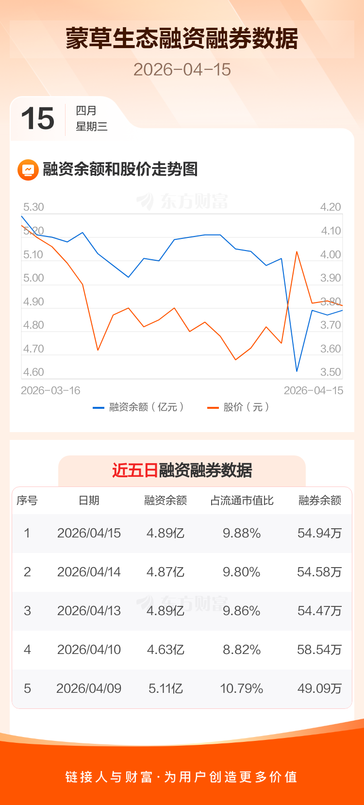 交易所最新数据显示,蒙草生态于2026年4月15日获融资买入2205.96万元,融资偿还2045.09万元,当日融资净买入160.87万元。目前,该股融资余额4.89亿,占流通市值比例为9.88%。