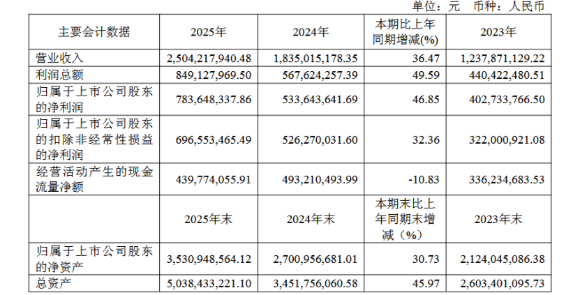 2025年,该公司实现营业收入25.04亿元,同比增长36.47%;归母净利润7.84亿元,同比增长46.85%;基本每股收益4.66元。公司拟每10股派发现金红利5元(含税),每10股转增3股。
