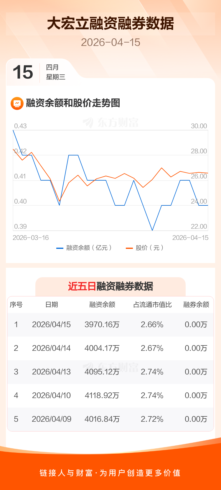 交易所最新数据显示,大宏立于2026年4月15日获融资买入162.91万元,融资偿还196.92万元,当日融资净偿还34.02万元。目前,该股融资余额3970.16万,占流通市值比例为2.66%。