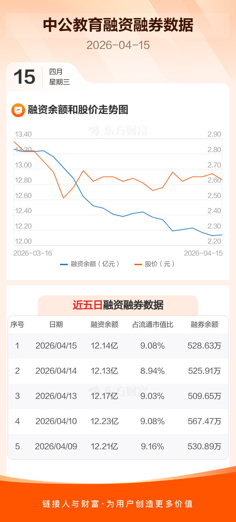 交易所最新数据显示,中公教育于2026年4月15日获融资买入1021.78万元,融资偿还883.64万元,当日融资净买入138.14万元。目前,该股融资余额12.14亿,占流通市值比例为9.08%。