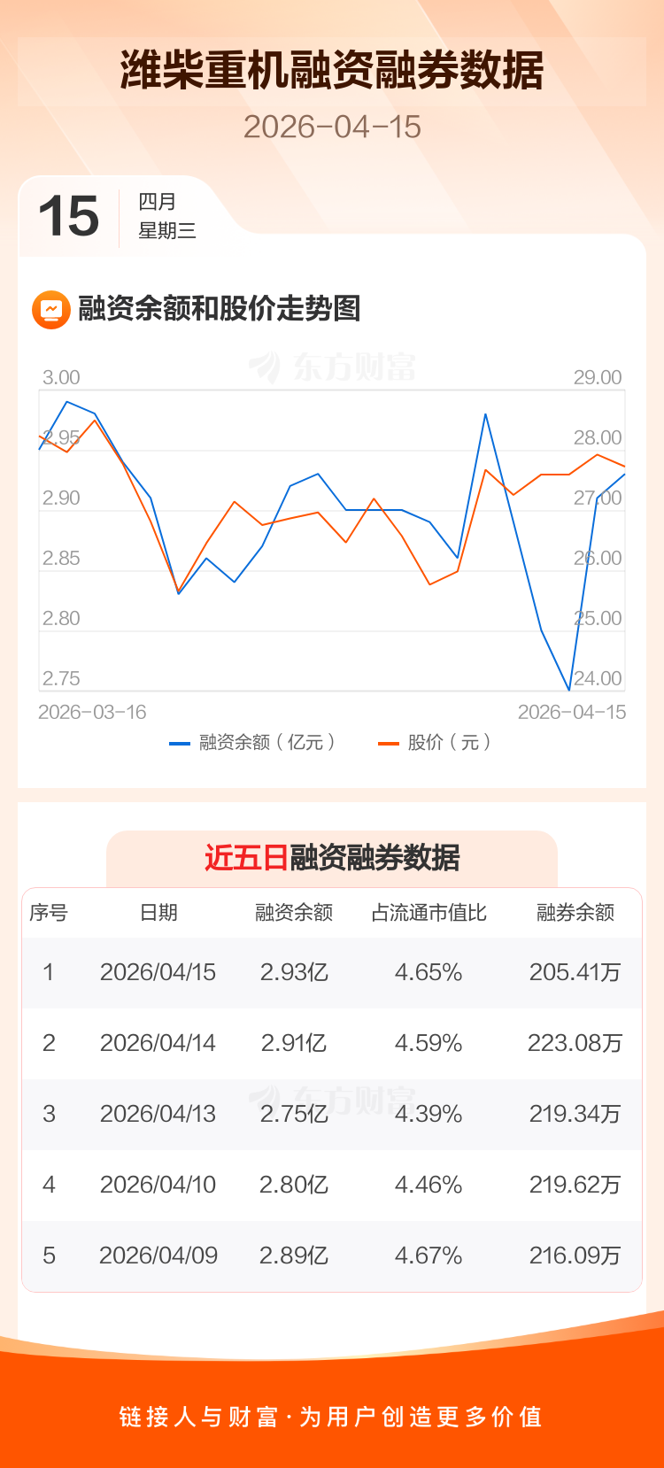 交易所最新数据显示,潍柴重机于2026年4月15日获融资买入3061.57万元,融资偿还2882.30万元,当日融资净买入179.27万元。目前,该股融资余额2.93亿,占流通市值比例为4.65%。