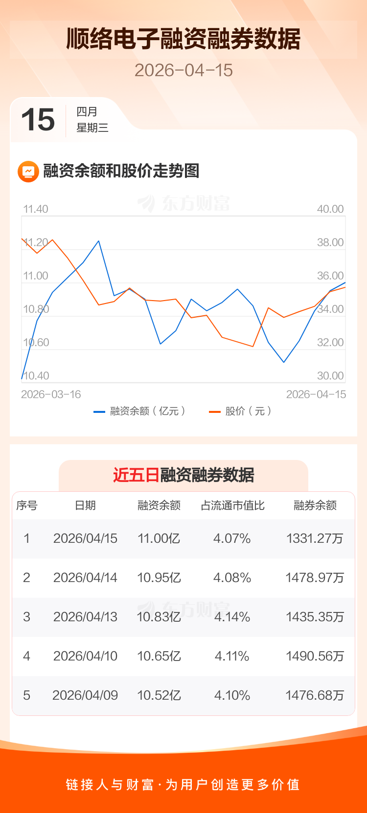 交易所最新数据显示,顺络电子于2026年4月15日获融资买入9733.13万元,融资偿还9232.59万元,当日融资净买入500.54万元。目前,该股融资余额11.00亿,占流通市值比例为4.07%。