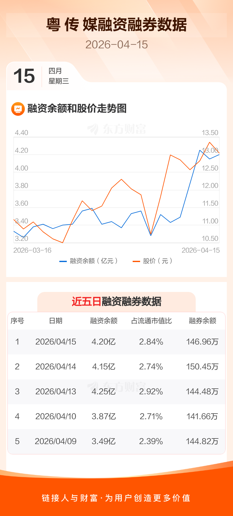 交易所最新数据显示,粤 传 媒于2026年4月15日获融资买入1.13亿元,融资偿还1.09亿元,当日融资净买入455.28万元。目前,该股融资余额4.20亿,占流通市值比例为2.84%。