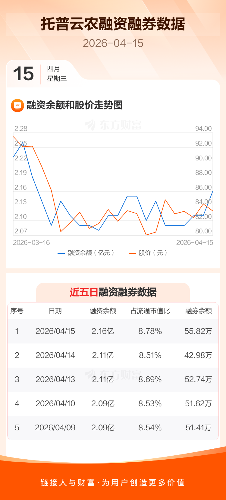 交易所最新数据显示,托普云农于2026年4月15日获融资买入1164.28万元,融资偿还724.10万元,当日融资净买入440.18万元。目前,该股融资余额2.16亿,占流通市值比例为8.78%。