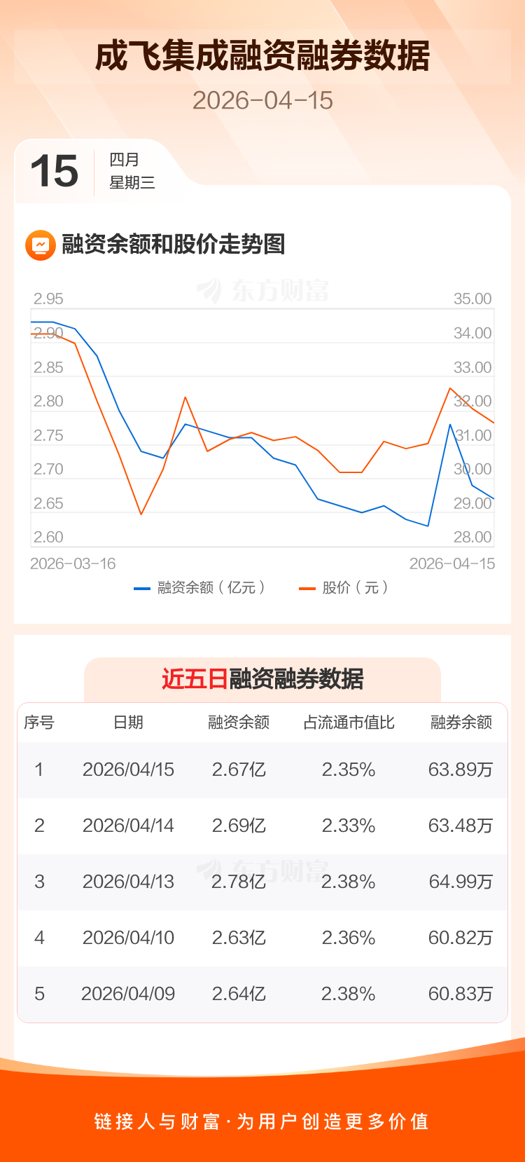 交易所最新数据显示,成飞集成于2026年4月15日获融资买入963.38万元,融资偿还1111.33万元,当日融资净偿还147.94万元。目前,该股融资余额2.67亿,占流通市值比例为2.35%。