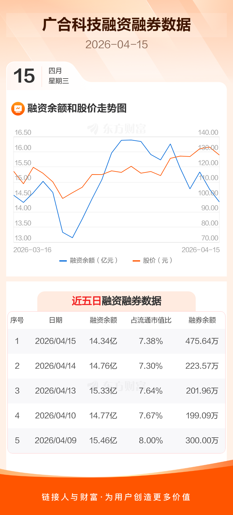 交易所最新数据显示,广合科技于2026年4月15日获融资买入1.01亿元,融资偿还1.43亿元,当日融资净偿还4201.07万元。目前,该股融资余额14.34亿,占流通市值比例为7.38%。