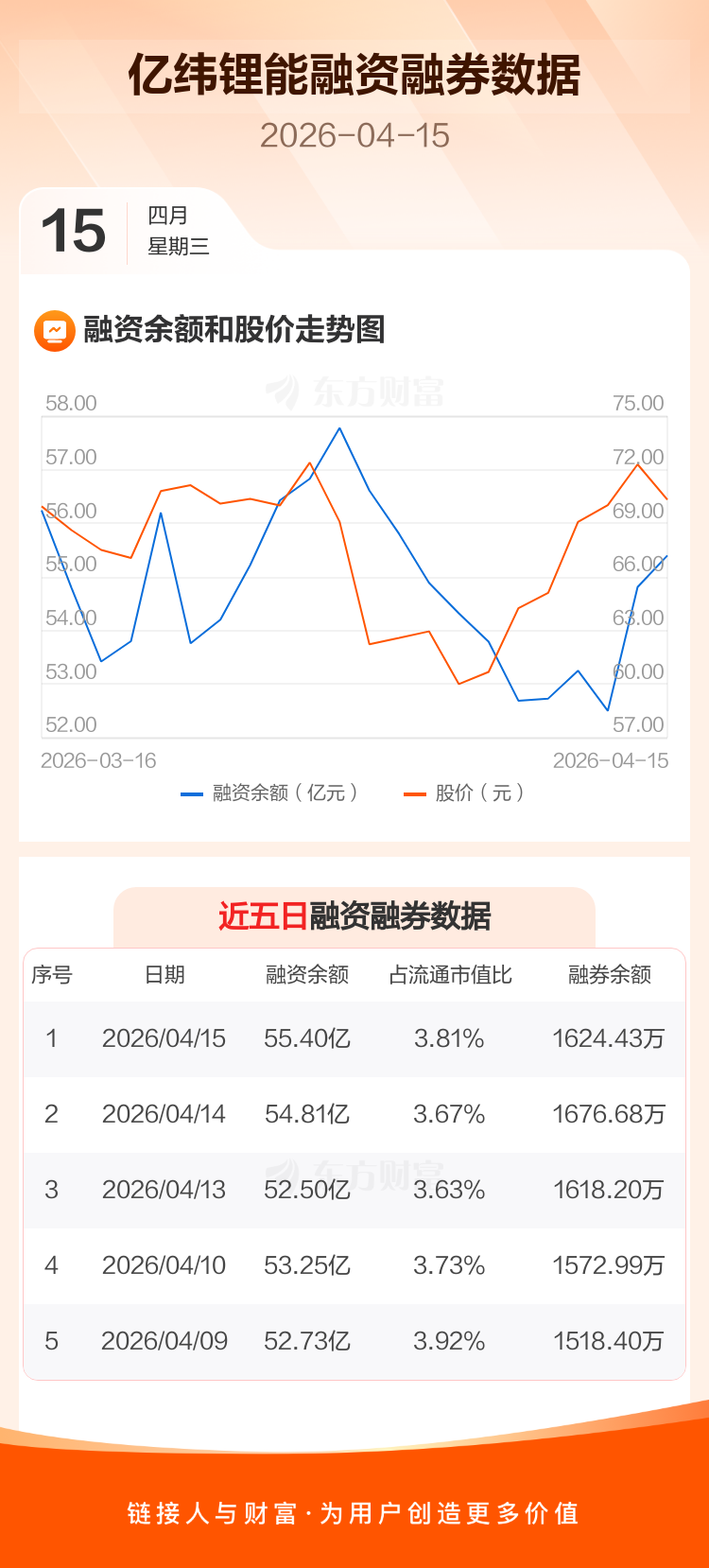 交易所最新数据显示,亿纬锂能于2026年4月15日获融资买入6.62亿元,融资偿还6.02亿元,当日融资净买入5904.36万元。目前,该股融资余额55.40亿,占流通市值比例为3.81%。
