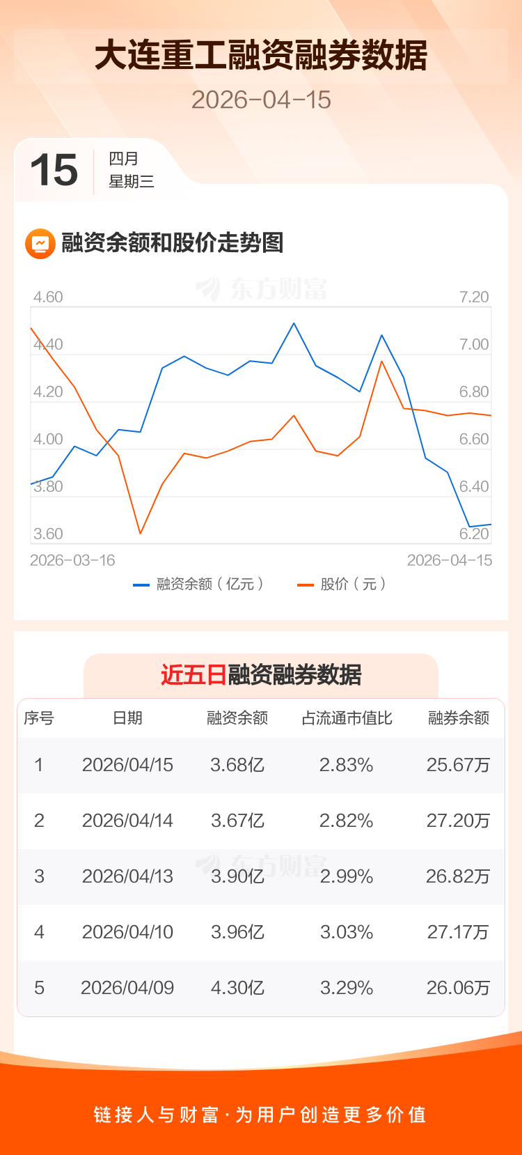 交易所最新数据显示,大连重工于2026年4月15日获融资买入1425.92万元,融资偿还1376.91万元,当日融资净买入49.01万元。目前,该股融资余额3.68亿,占流通市值比例为2.83%。