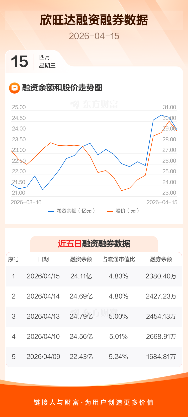 交易所最新数据显示,欣旺达于2026年4月15日获融资买入4.04亿元,融资偿还4.62亿元,当日融资净偿还5774.44万元。目前,该股融资余额24.11亿,占流通市值比例为4.83%。