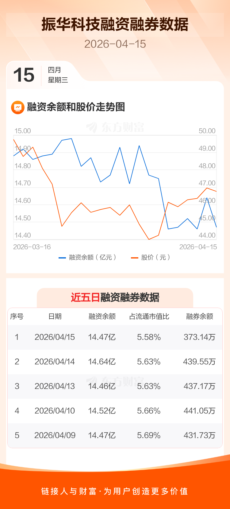 交易所最新数据显示,振华科技于2026年4月15日获融资买入4699.07万元,融资偿还6427.56万元,当日融资净偿还1728.49万元。目前,该股融资余额14.47亿,占流通市值比例为5.58%。