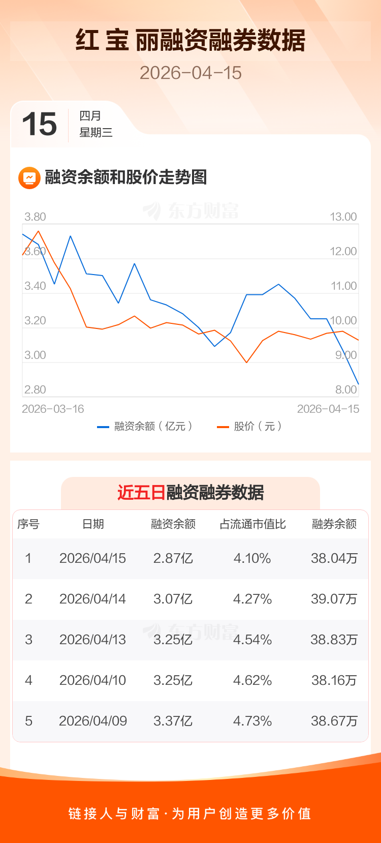 交易所最新数据显示,红 宝 丽于2026年4月15日获融资买入1940.04万元,融资偿还3968.31万元,当日融资净偿还2028.27万元。目前,该股融资余额2.87亿,占流通市值比例为4.10%。