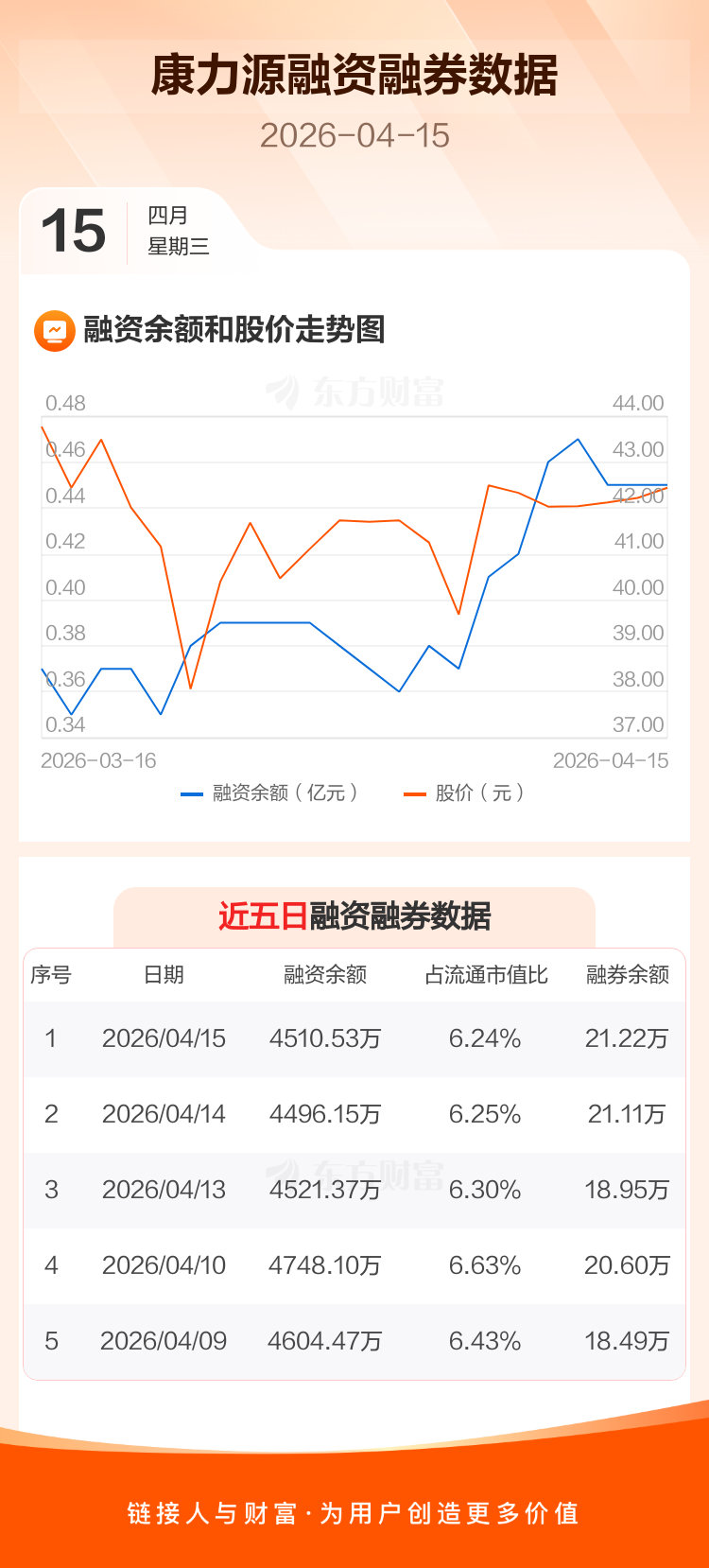 交易所最新数据显示,康力源于2026年4月15日获融资买入444.67万元,融资偿还430.29万元,当日融资净买入14.39万元。目前,该股融资余额4510.53万,占流通市值比例为6.24%。