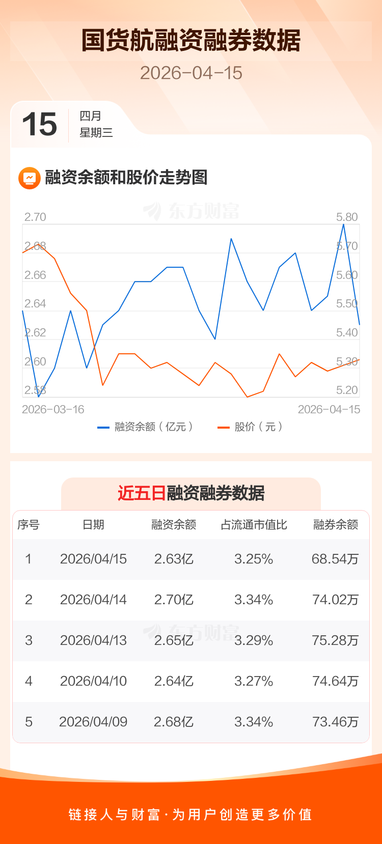 交易所最新数据显示,国货航于2026年4月15日获融资买入637.45万元,融资偿还1271.06万元,当日融资净偿还633.61万元。目前,该股融资余额2.63亿,占流通市值比例为3.25%。
