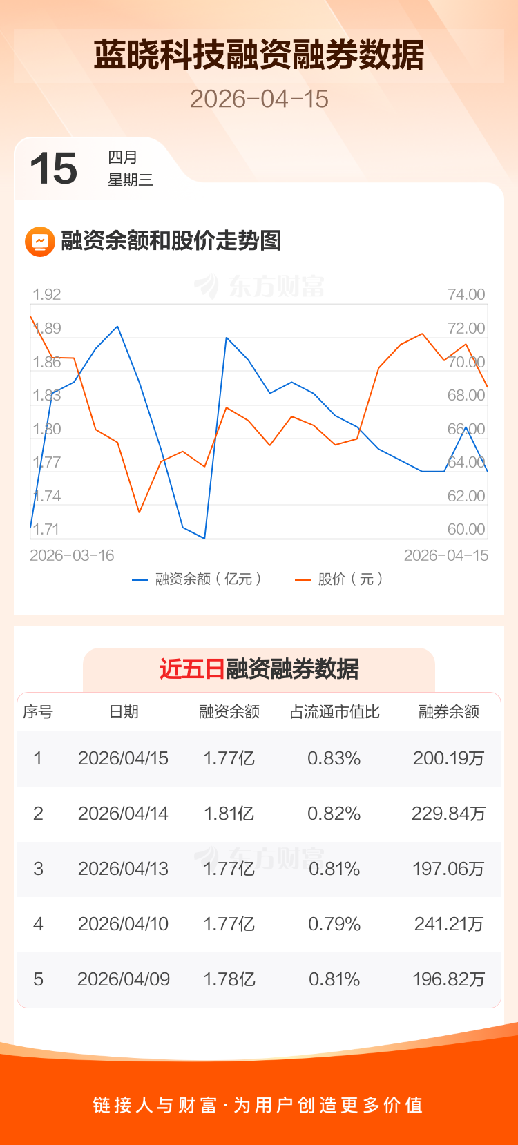 交易所最新数据显示,蓝晓科技于2026年4月15日获融资买入1781.23万元,融资偿还2200.49万元,当日融资净偿还419.26万元。目前,该股融资余额1.77亿,占流通市值比例为0.83%。