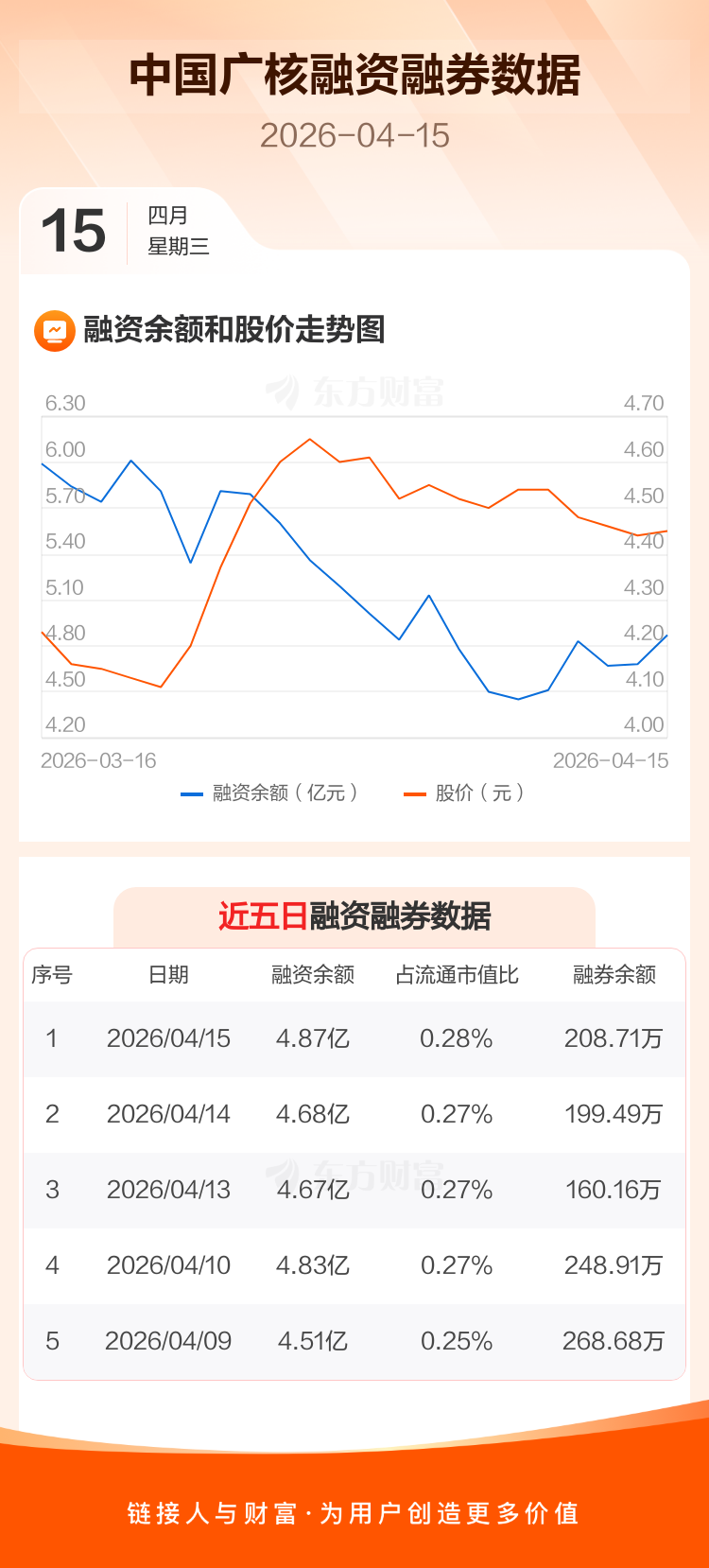 交易所最新数据显示,中国广核于2026年4月15日获融资买入9938.71万元,融资偿还8037.66万元,当日融资净买入1901.05万元。目前,该股融资余额4.87亿,占流通市值比例为0.28%。