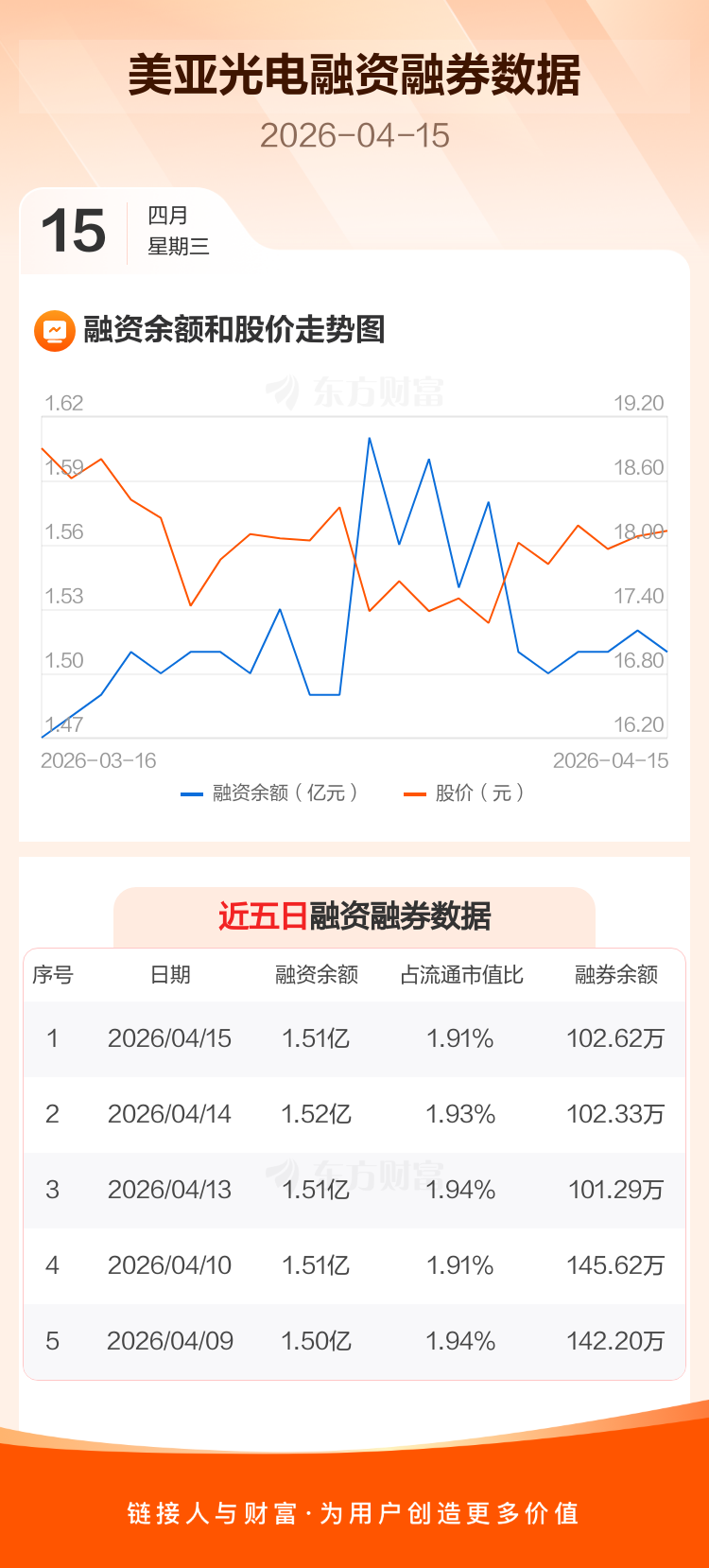 交易所最新数据显示,美亚光电于2026年4月15日获融资买入448.17万元,融资偿还563.55万元,当日融资净偿还115.38万元。目前,该股融资余额1.51亿,占流通市值比例为1.91%。