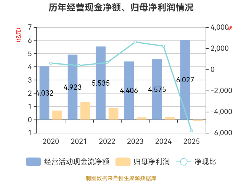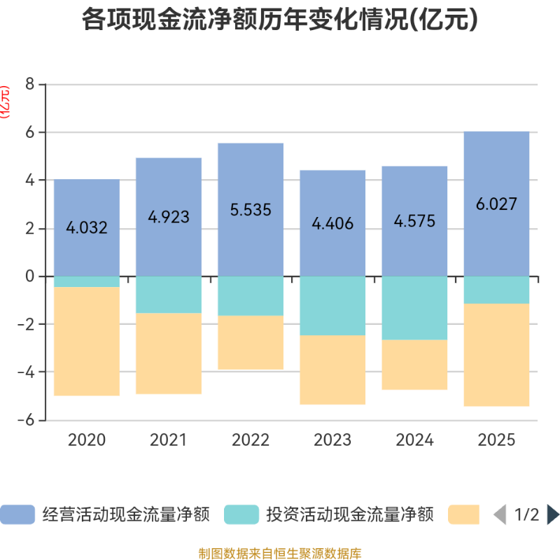 截至2025年,公司经营活动现金流净额为6.03亿元,同比增长31.75%;筹资活动现金流净额-4.28亿元,同比减少2.21亿元;投资活动现金流净额-1.15亿元,上年同期为-2.67亿元。